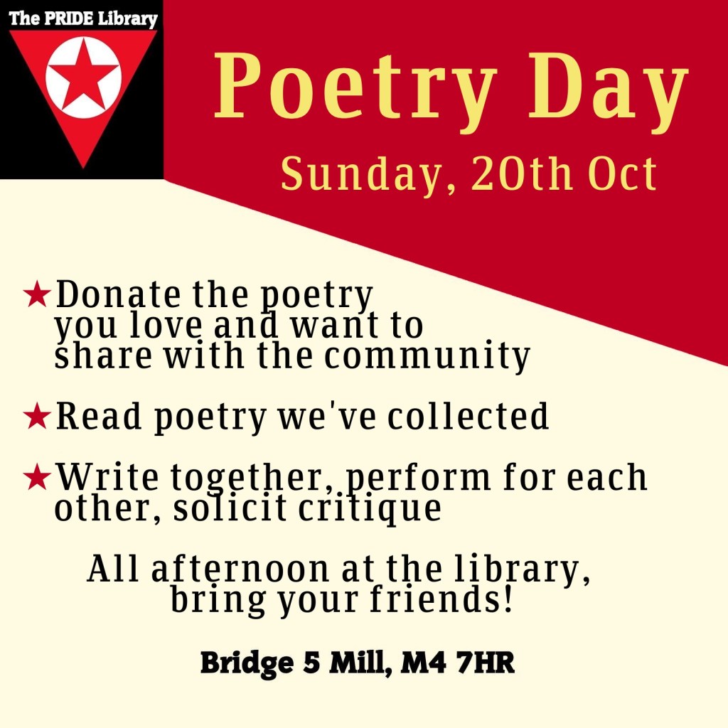 This Sunday we’re holding a Poetry Day at the library. We’re encouraging donations of poetry, whether your own work or one of your favourites, and highlighting that which we already have in stock. We’ll offer space to sit and read, write, perform, or discuss poetry. If you can’t make it in but would like to donate books you can send them to us via post, if you would like to make a financial contribution please email for our details.